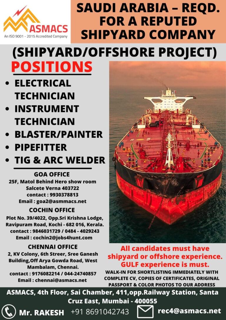 SAUDI ARABIA – REQD.FOR A REPUTEDASMACSSHIPYARD COMPANY(SHIPYARD/OFFSHORE PROJECT)POSITIONS• ELECTRICALTECHNICIAN• INSTRUMENTTECHNICIAN• BLASTER/PAINTER• PIPEFITTER• TIG & ARC WELDERSSLETOPSGOA OFFICE25F, Matol Behind Hero …