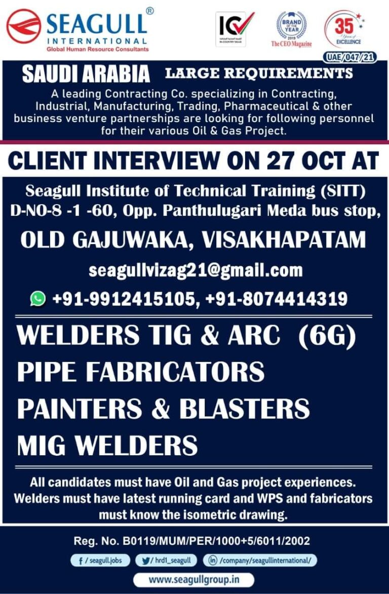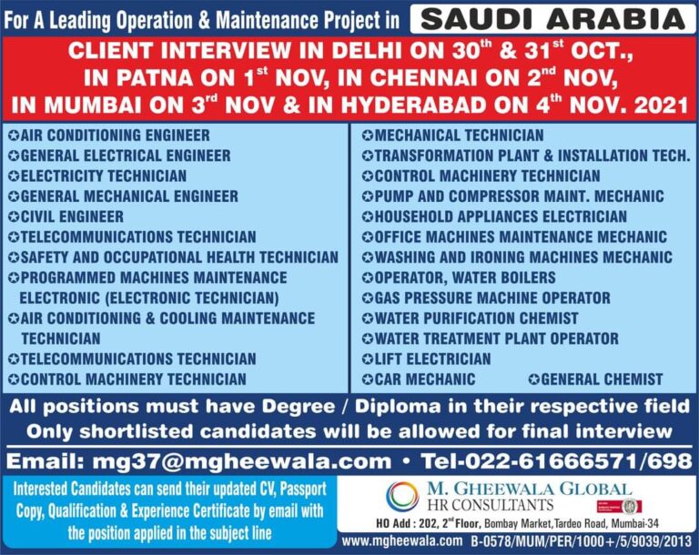For A Leading Operation & Maintenance Project in SAUDI ARABIACLIENT INTERVIEW IN DELHI ON 30th & 315 OCT.,IN PATNA ON …
