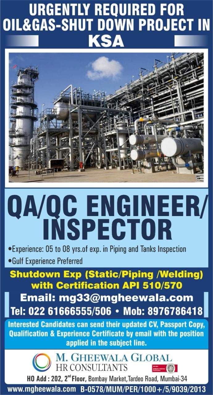 URGENTLY REQUIRED FOROIL&GAS-SHUT DOWN PROJECT INKSAQA/QC ENGINEER/INSPECTOR•Experience: 05 to 08 yrs.of exp. in Piping and Tanks InspectionGulf Experience PreferredShutdown Exp …