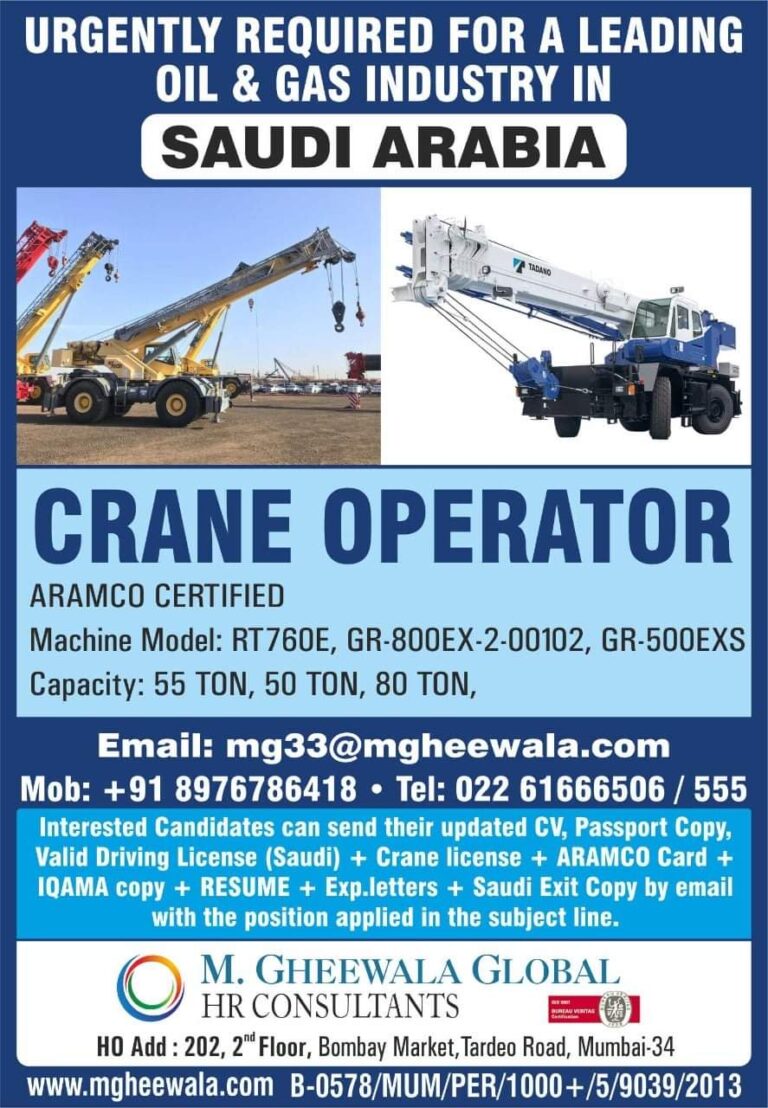 URGENTLY REQUIRED FOR A LEADINGOIL & GAS INDUSTRY INSAUDI ARABIACRANE OPERATORARAMCO CERTIFIEDMachine Model: RT760E, GR-800EX-2-00102, GR-500EXSCapacity: 55 TON, 50 TON, …