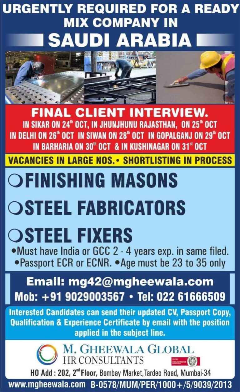 URGENT REQUIREMENTFOR A LEADINGSHOPFITTING/ INTERIOR CO.CLIENT INTERVIEW IN MUMBAISHORTLISTING ON 29 OCTOBERWOOD MACHINE OPERATORWELDER CUM FABRICATOR (SS)FINISHING CARPENTERELECTRICIANSAC TECHNICIANLAHPLUMBERSIGNAGE FABRICATORSIGNAGE …