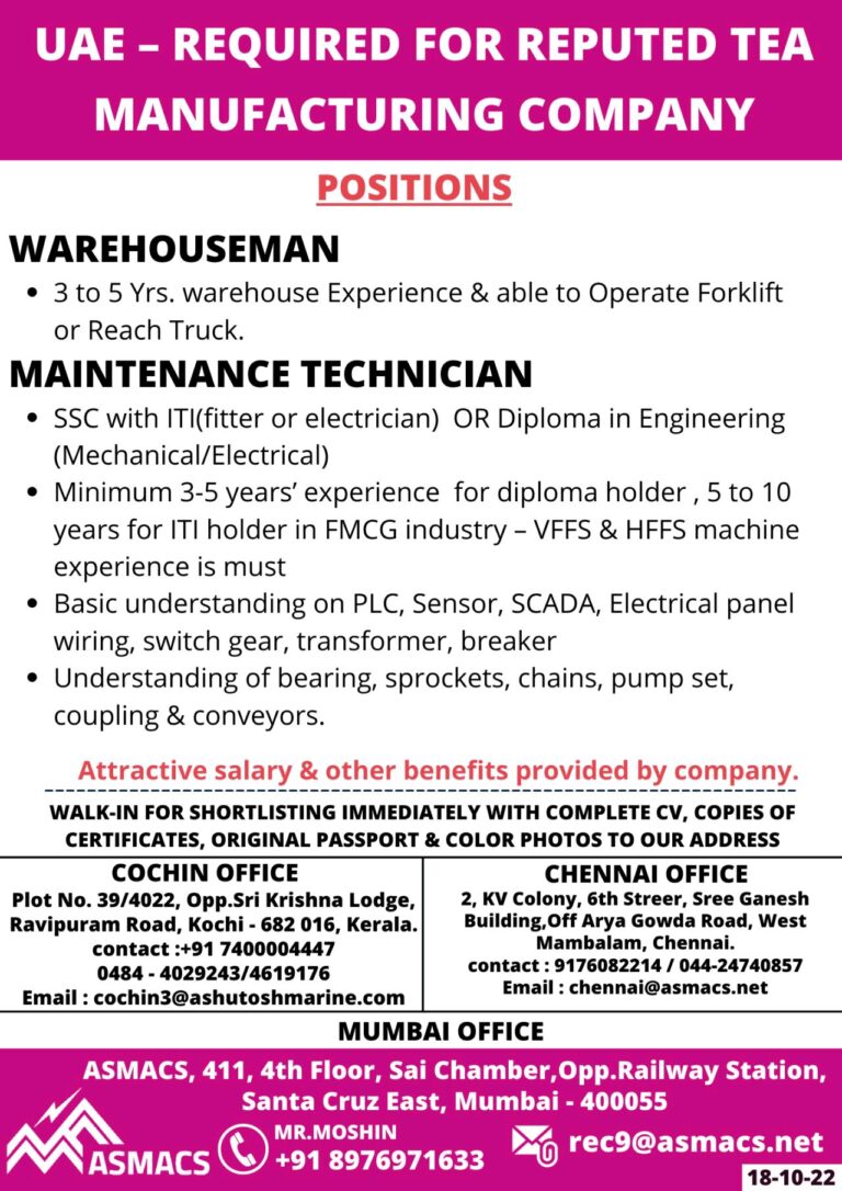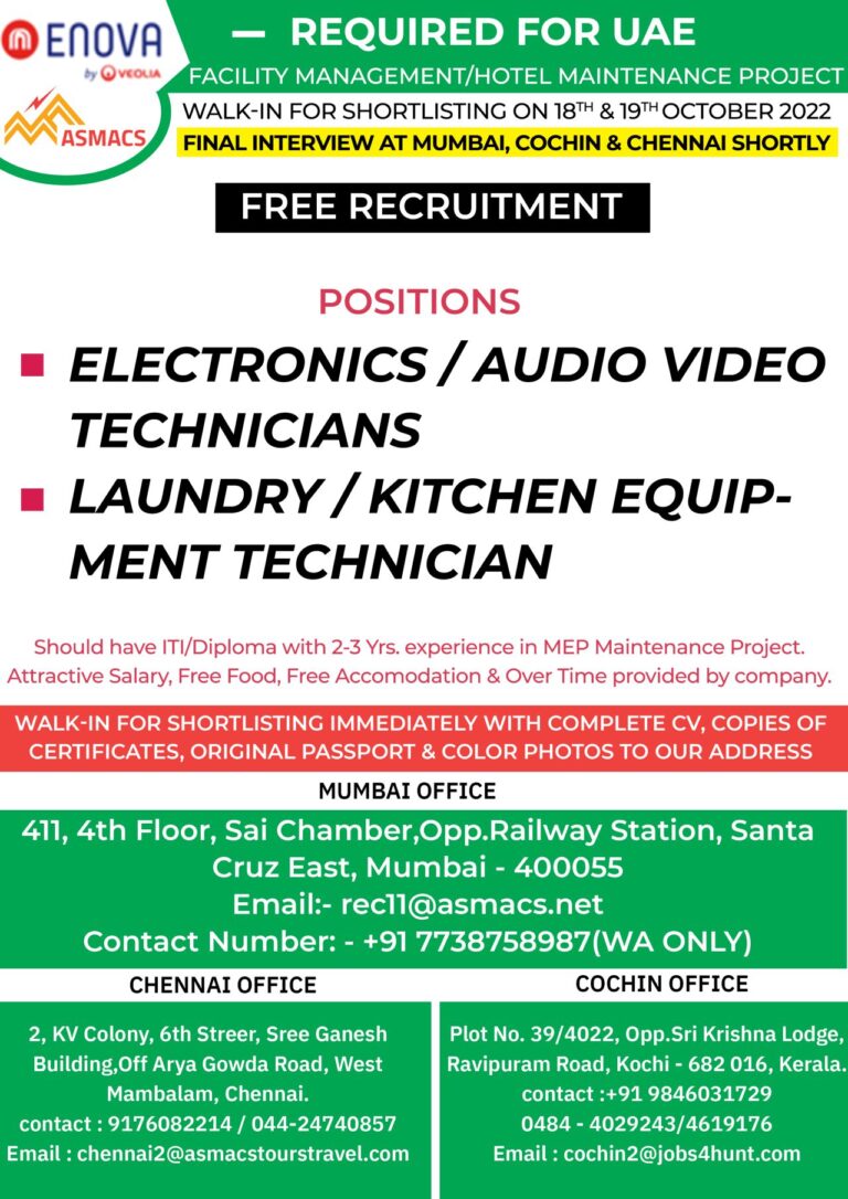 REQUIRED FOR UAEFACILITY MANAGEMENT/HOTEL MAINTENANCE PROJECTWALK-IN FOR SHORTLISTING ON 18TH & 19TH OCTOBER 2022ASMACSFINAL INTERVIEW AT MUMBAI, COCHIN & CHENNAI …