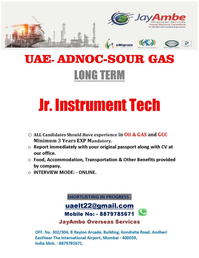 LONG TERM Jr. Instrument TechOil & GAS and GCCO ALL Candidates Should Have experience inMinimum 3 Years EXP Mandatory.Report immediately …
