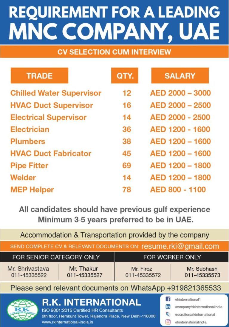 REQUIREMENT FOR A LEADINGMNC COMPANY, UAECV SELECTION CUM INTERVIEWTRADEChilled Water SupervisorHVAC Duct SupervisorElectrical SupervisorElectricianPlumbersHVAC Duct FabricatorPipe FitterWelderMEP HelperAll candidates should …