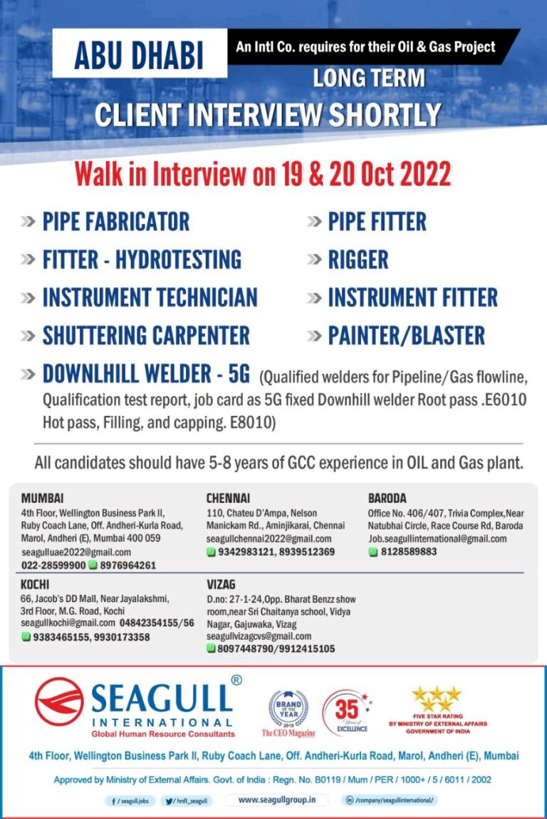 ABU DHABIAn Intl Co. requires for their Oil & Gas ProjectCLIENT INTERVIEW SHORTLYWalk in Interview on 19 & 20 Oct …