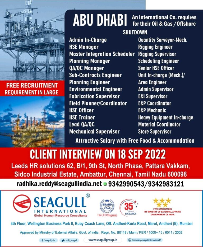 FREE RECRUITMENTREQUIREMENT IN LARGEABU DHABIAn International Co. requiresfor their Oil & Gas /OffshoreAdmin In-ChargeHSE ManagerSHUTDOWNQuantity Surveyor-Mech.Rigging EngineerMaster Integration Scheduler Rigging …