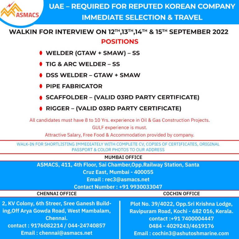 UAE – REQUIRED FOR REPUTED KOREAN COMPANYIMMEDIATE SELECTION & TRAVELWALKIN FOR INTERVIEW ON & 15TH SEPTEMBER 2022POSITIONSWELDER (CTAW + SMAW) …