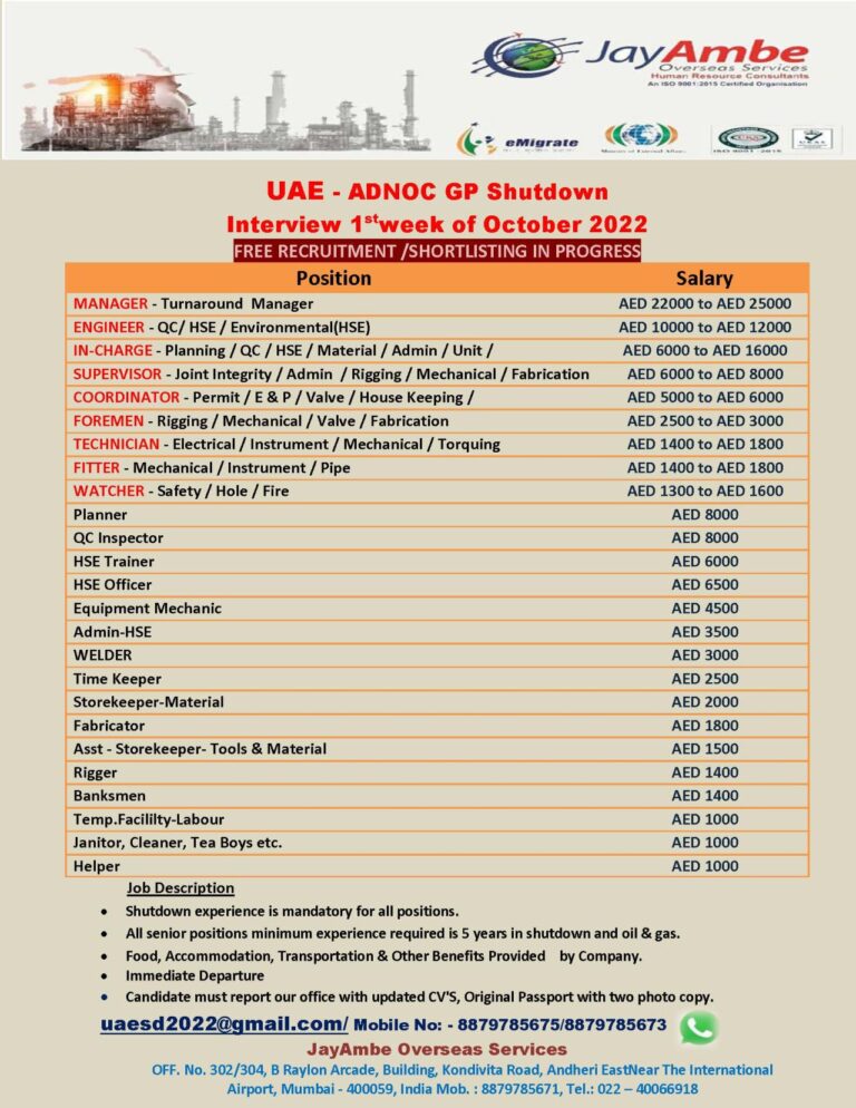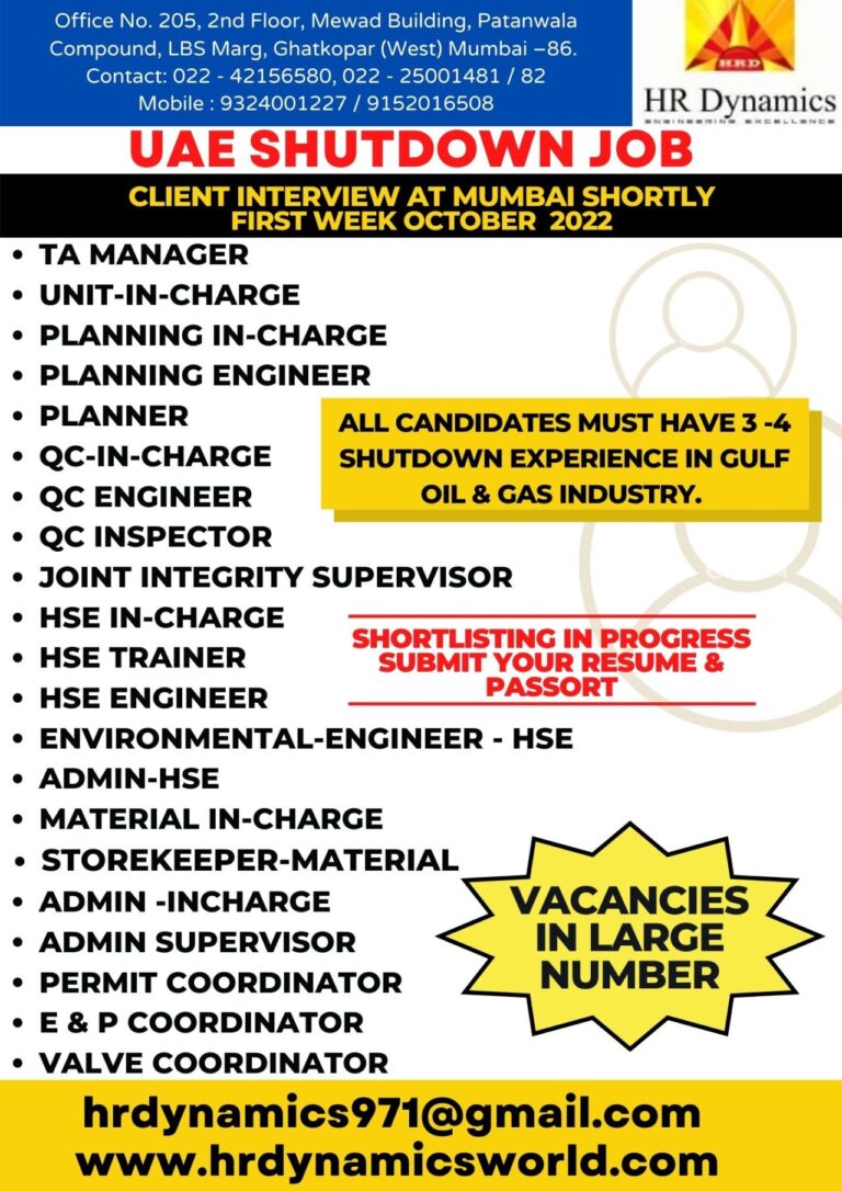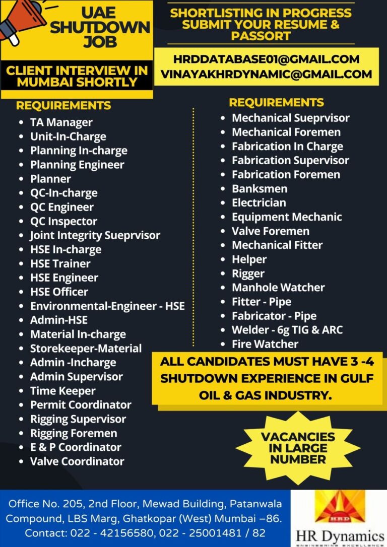 UAE SHUTDOWN JOBCLIENT INTERVIEW INMUMBAI SHORTLYREQUIREMENTSTA ManagerUnit-In-ChargePlanning In-chargePlanning EngineerPlannerQC-In-chargeQC EngineerQC InspectorSHORTLISTING IN PROGRESSSUBMIT YOUR RESUME &PASSORTHRDDATABASEOI@CMAIL.COMVINAYAKHRDYNAMIC@CMAIL.COMJoint Integrity SueprvisorHSE In-chargeI-ISE TrainerHSE …