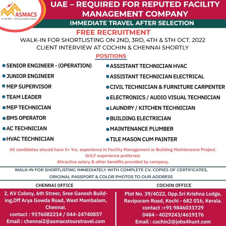 FREE RECRUITMENTWALK-IN FOR SHORTLISTING ON 2ND, 3RD, 4TH & 5TH OCT. 2022CLIENT INTERVIEW AT COCHIN & CHENNAI SHORTLYPOSITIONSo SENIOR ENGINEER …