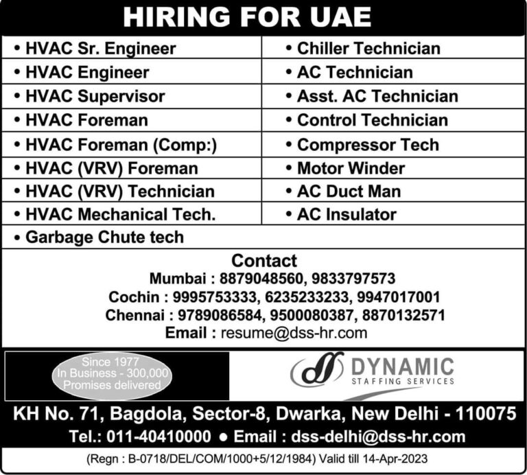 HIRING FOR UAE• HVAC Sr. Engineer• Chiller Technician• HVAC Engineer• AC Technician• HVAC Supervisor• Asst. AC TechnicianHVAC Foreman• Control TechnicianHVAC …