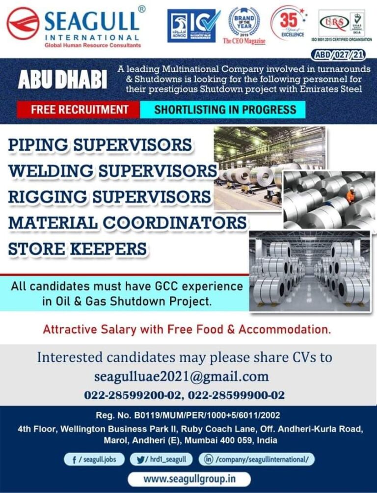 A leading Multinational Company involved in turnarounds& Shutdowns is looking for the following personnel fortheir prestigious Shutdown project with Emirates …