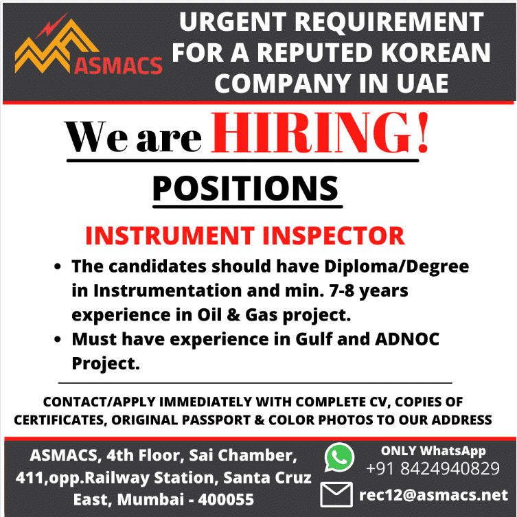 URGENT REQUIREMENTFOR A REPUTED KOREAN ASMACSCOMPANY IN UAEWe are HIRING!POSITIONSINSTRUMENT INSPECTOR• The candidates should have Diploma/Degreein Instrumentation and min. 7-8 …