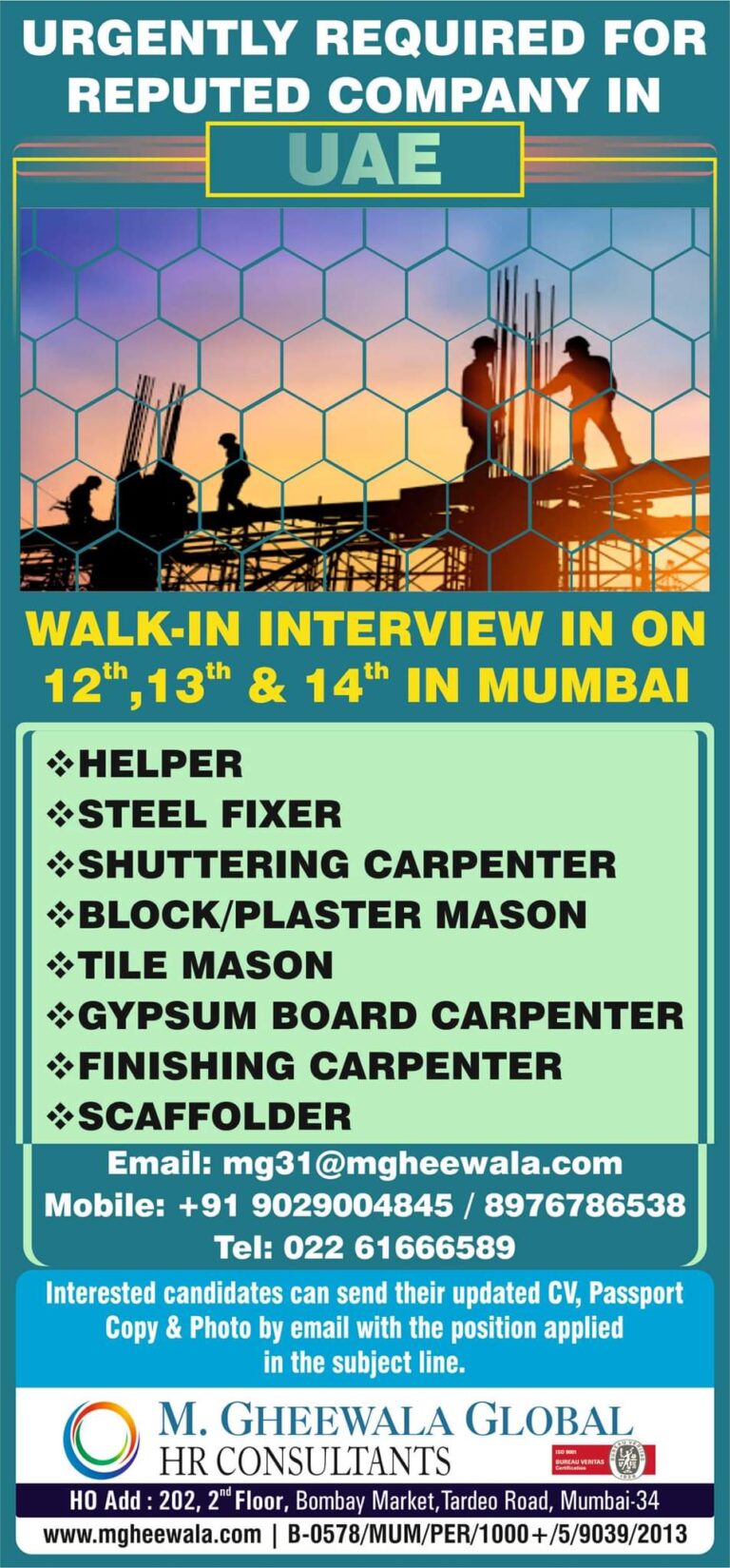 URGENTLY REQUIRED FORREPUTED COMPANY INUAEWALK-IN INTERVIEW IN ON12th, 13th & 14th IN MUMBAIHELPERSTEEL FIXERSHUTTERING CARPENTERBLOCK/PLASTER MASONTILE MASONGYPSUM BOARD CARPENTERFINISHING CARPENTERSCAFFOLDEREmail: …