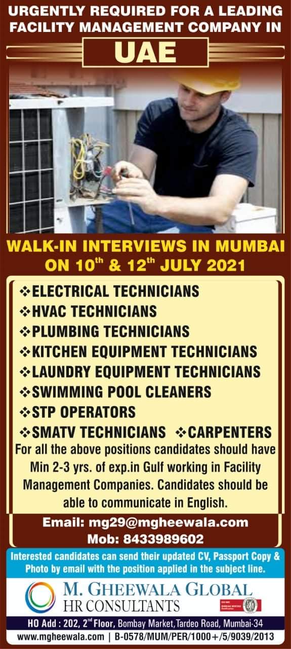 URGENTLY REQUIRED FOR A LEADINGFACILITY MANAGEMENT COMPANY INUAEWALK-IN INTERVIEWS IN MUMBAION 10th & 12th JULY 2021ELECTRICAL TECHNICIANSHVAC TECHNICIANSPLUMBING TECHNICIANSKITCHEN EQUIPMENT …