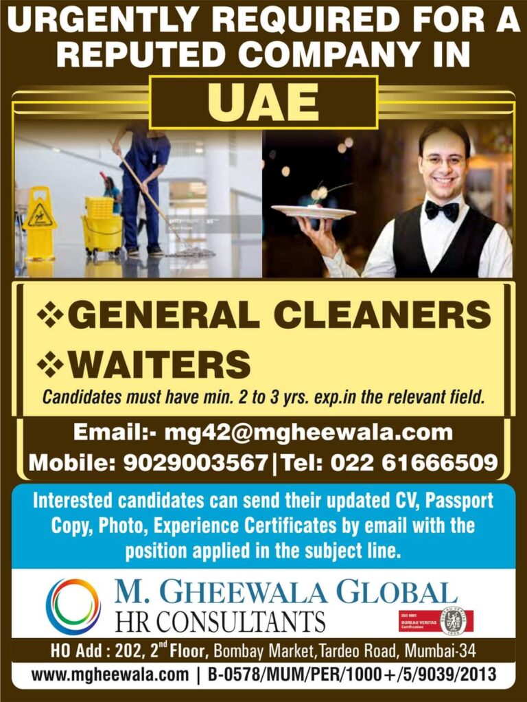 URGENTLY REQUIRED FOR AREPUTED COMPANY IN UAEGENERAL CLEANERSWAITERSCandidates must have min. 2 to 3 yrs. exp.in the relevant field.Email:-mg42@mgheewala.comMobile: 9029003567 …