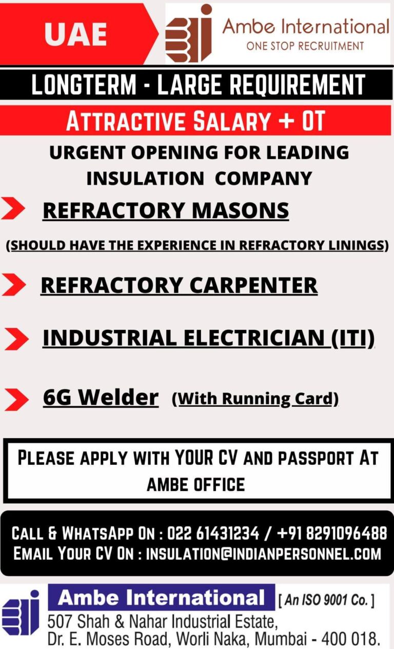 LONG TERM – LARGE REQUIREMENTATTRACTIVE SALARY + OTURGENT OPENING FOR LEADINGINSULATION COMPANYREFRACTORY MASONS(SHOULD HAVE THE EXPERIENCE IN REFRACTORY LININGS)REFRACTORY CARPENTERINDUSTRIAL …