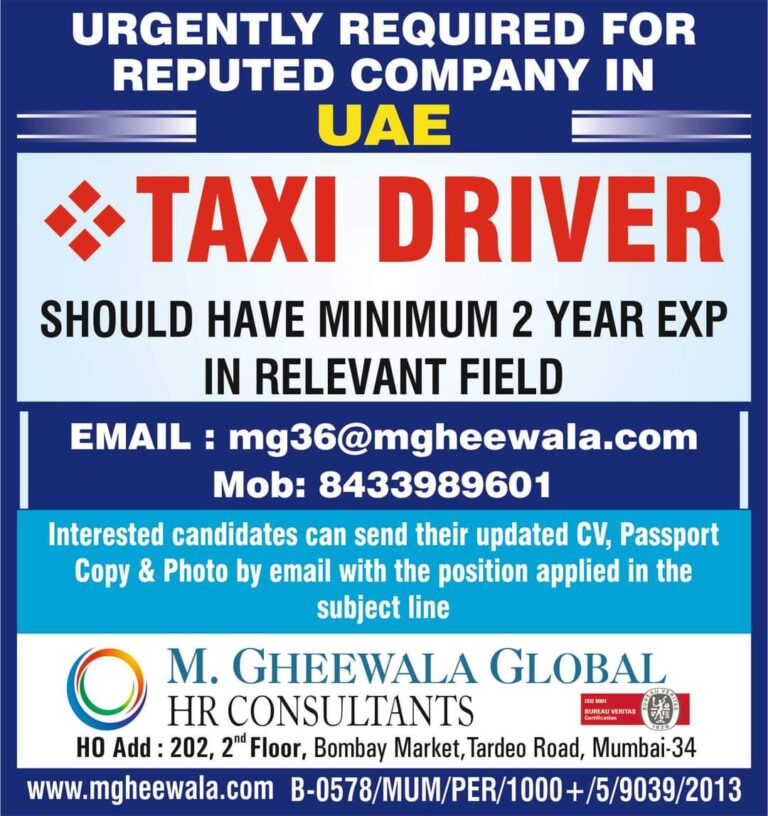 URGENTLY REQUIRED FORREPUTED COMPANY IN UAETAXI DRIVERSHOULD HAVE MINIMUM 2 YEAR EXPIN RELEVANT FIELDEMAIL : mg36@mgheewala.comMob: 8433989601Interested candidates can send …