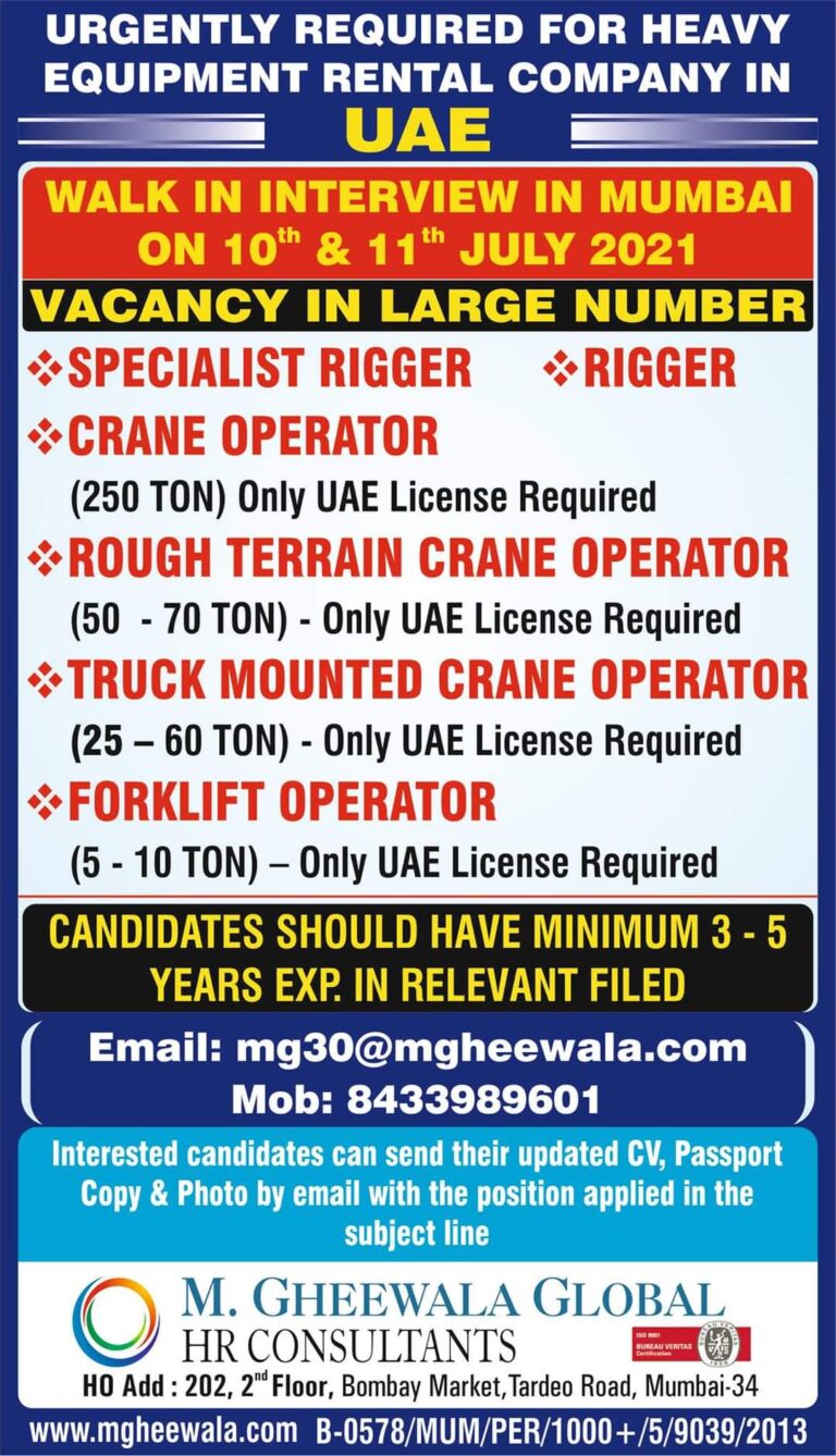 URGENTLY REQUIRED FOR HEAVYEQUIPMENT RENTAL COMPANY IN UAEWALK IN INTERVIEW IN MUMBAION 10th & 11th JULY 2021VACANCY IN LARGE NUMBERSPECIALIST …