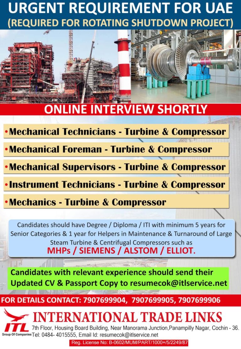 URGENT REQUIREMENT FOR UAE(REQUIRED FOR ROTATING SHUTDOWN PROJECT)ONLINE INTERVIEW SHORTLY• Mechanical Technicians – Turbine & Compressor• Mechanical Foreman – Turbine …