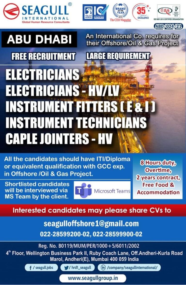 An International Co. requires fortheir Offshore/Oil & Gas ProjectABU DHABIFREE RECRUITMENT LARGE REQUIREMENTELECTRICIANSELECTRICIANS – HV/LVINSTRUMENT FITTERS TE &1]INSTRUMENT TECHNICIANSCAPLE JOINTERS …