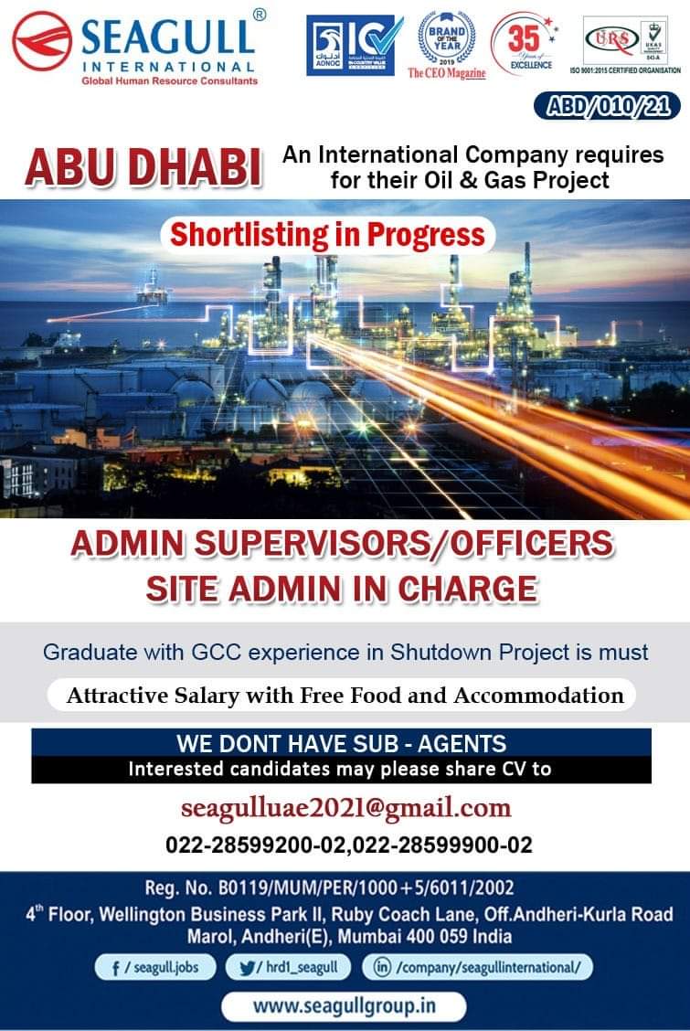 ABU DHABI An International Company requiresfor their Oil & Gas Project Shortlisting in ProgressADMIN SUPERVISORS/OFFICERSSITE ADMIN IN CHARGEGraduate with GCC …