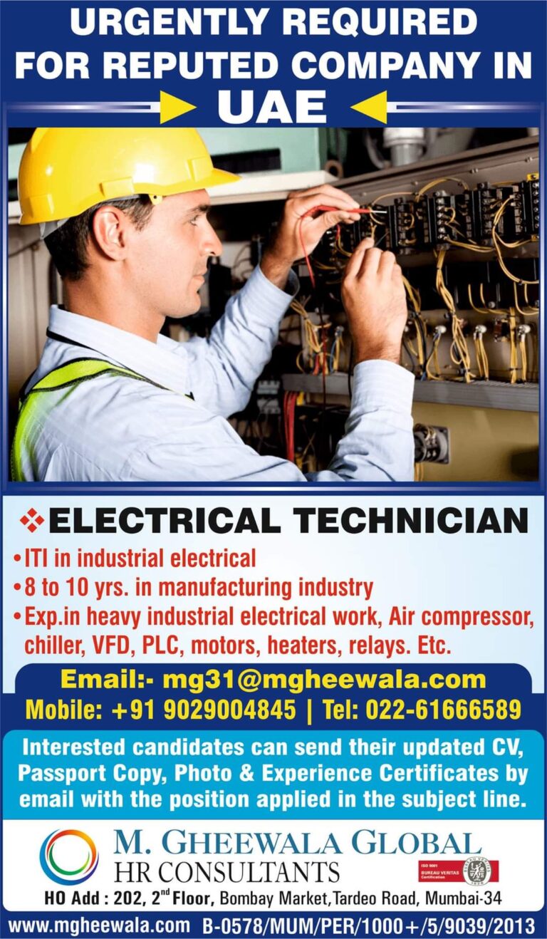 URGENTLY REQUIRED FOR REPUTED COMPANY IN – UAE* ELECTRICAL TECHNICIAN • ITI in industrial electrical • 8 to 10 yrs. …