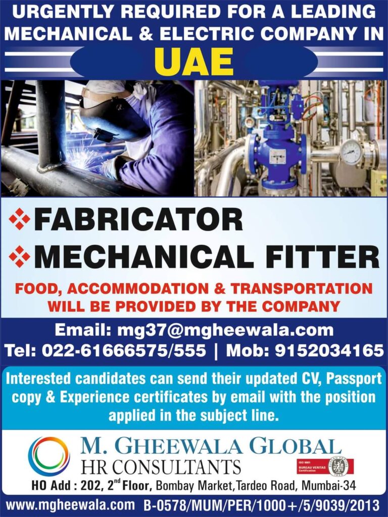 URGENTLY REQUIRED FOR A LEADING MECHANICAL & ELECTRIC COMPANY INUAE•FABRICATOR •MECHANICAL FITTERFOOD, ACCOMMODATION & TRANSPORTATION WILL BE PROVIDED BY THE …