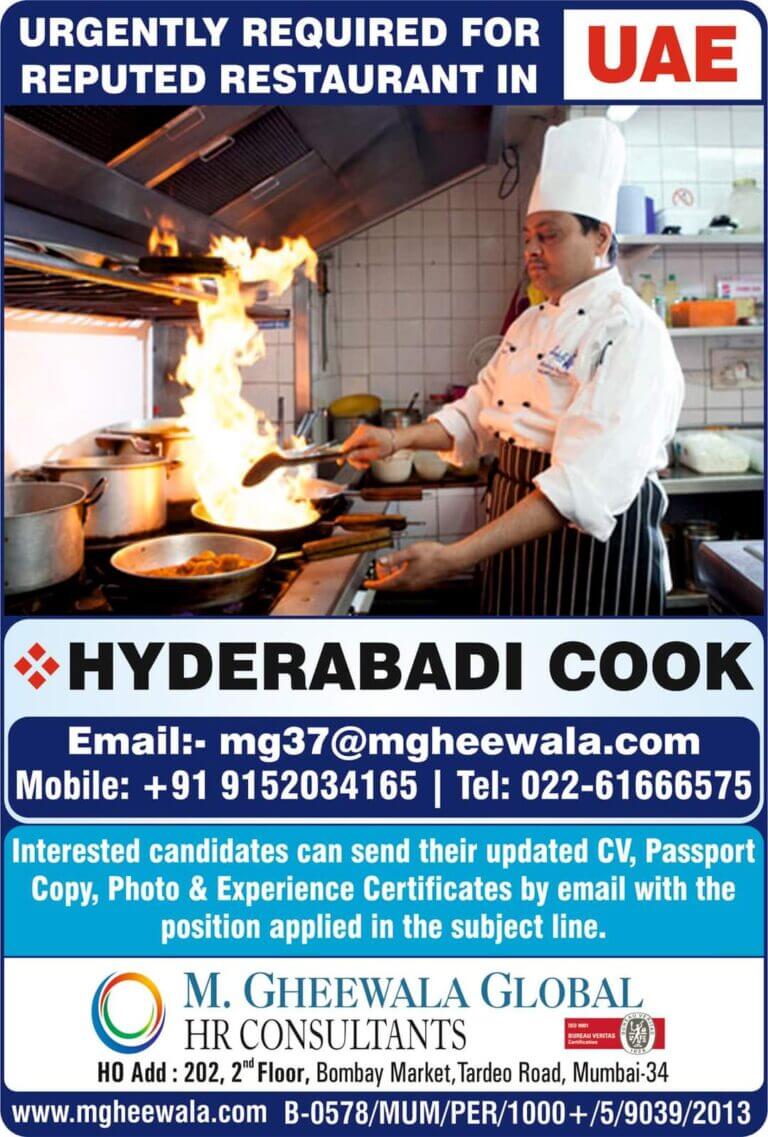 URGENTLY REQUIRED FOR REPUTED RESTAURANT IN UAEHYDERABADI COOKEmail:- mg37@mgheewala.com Mobile: +91 9152034165 Tel: 022-61666575Interested candidates can send their updated CV, …