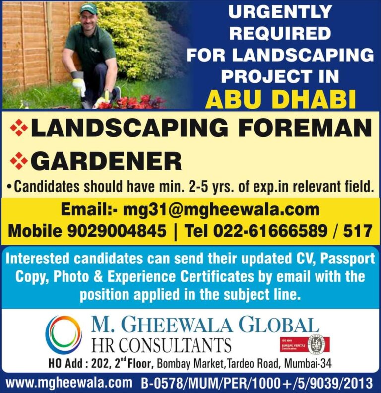 URGENTLY REQUIRED FOR LANDSCAPING PROJECT INABU DHABILANDSCAPING FOREMANGARDENER•Candidates should have min. 2-5 yrs. of exp.in relevant field.Email:- mg31@mgheewala.comMobile 9029004845 | …