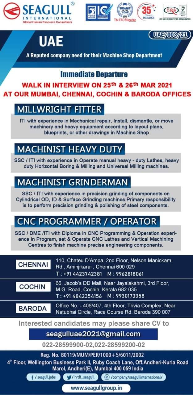 A Reputed company need tor their Machine Shop Department Immediate Departure WALK IN INTERVIEW ON 25th & 26th MAR 2021 …