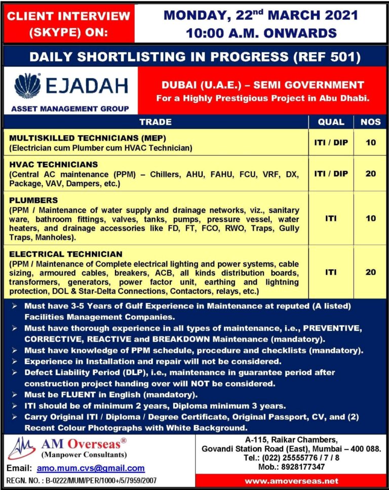 CLIENT INTERVIEW(SKYPE) ON:MONDAY, 22nd MARCH 202110:00 A.M. ONWARDSDAILY SHORTLISTING IN PROGRESS (REF 501)DUBAI (U.A.E.) – SEMI GOVERNMENTFor a Highly Prestigious …