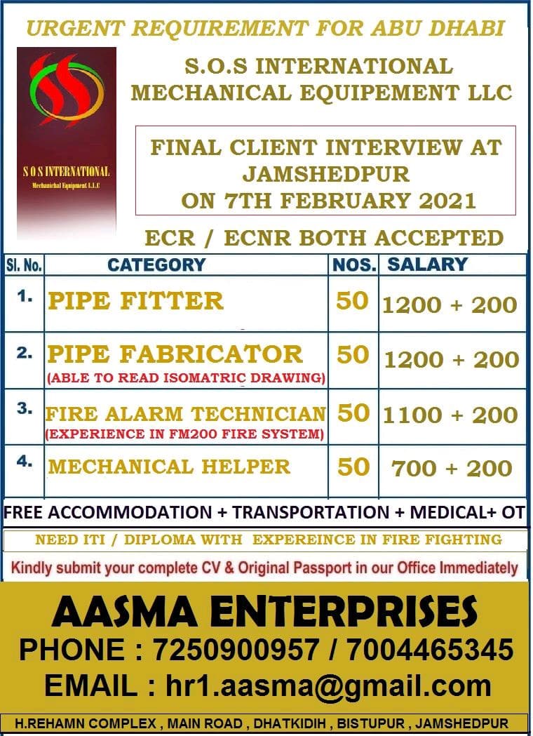 URGENT REQUIREMENT FOR ABU DHABIS.O.S INTERNATIONALMECHANICAL EQUIPEMENT LLCS OSIN’IHUTIOUI,FINAL CLIENT INTERVIEW ATJAMSHEDPURON 7TH FEBRUARY 2021ECR / ECNR BOTH ACCEPTEDCATEGORYPIPE FITTERNOS. …