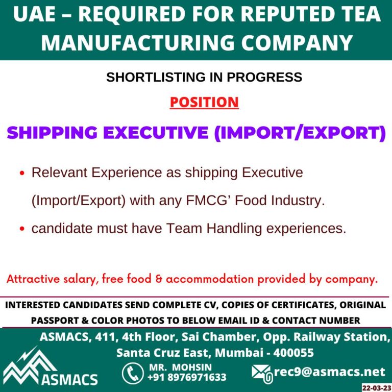 UAE – REQUIRED FOR REPUTED TEAMANUFACTURING COMPANYSHORTLISTING IN PROGRESSPOSITIONSHIPPING EXECUTIVE (IMPORT/EXPORT)• Relevant Experience as shipping Executive(Import/Export) with any FMCG’ Food …
