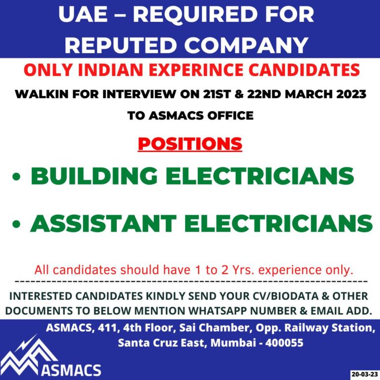 UAE – REQUIRED FORREPUTED COMPANYONLY INDIAN EXPERINCE CANDIDATESWALKIN FOR INTERVIEW ON 21ST & 22ND MARCH 2023TO ASMACS OFFICEPOSITIONS• BUILDING ELECTRICIANS• …