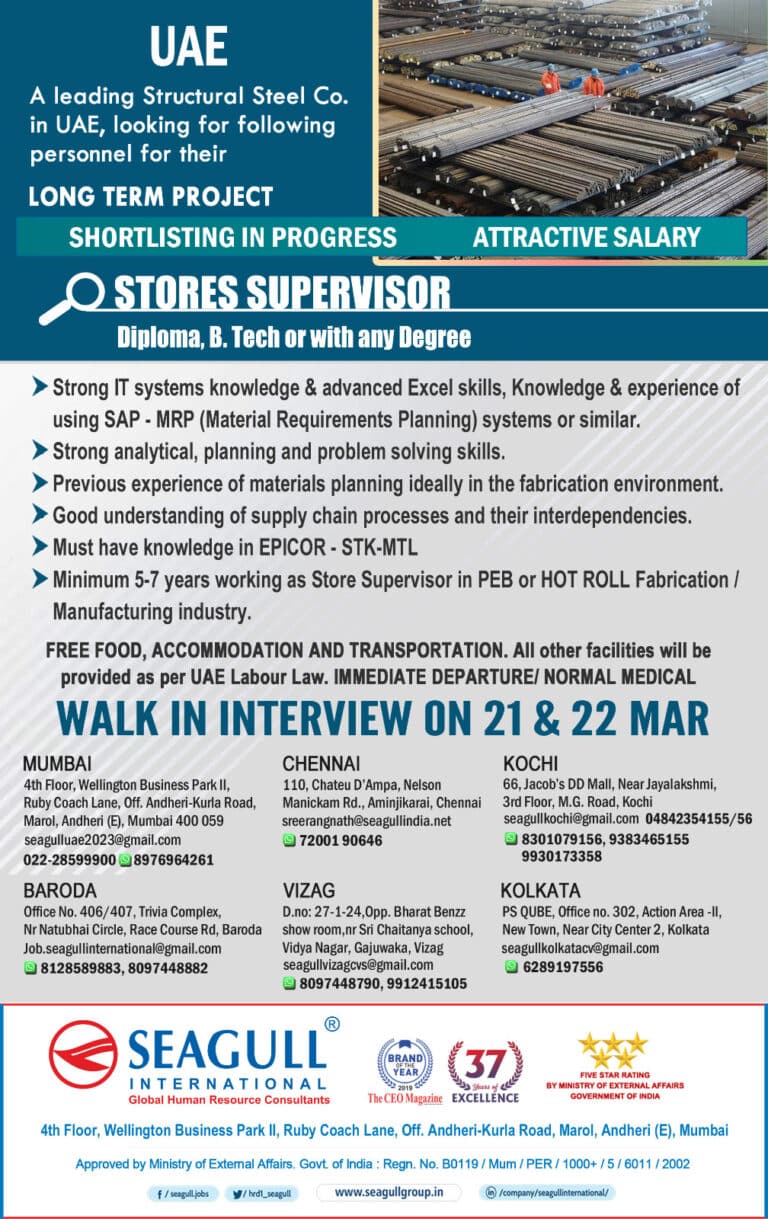 UAEA leading Structural Steel Co.in UAE, looking for following personnel for theirLONG TERM PROJECTSHORTLISTING IN PROGRESSATTRACTIVE SALARYSTORES SUPERVISORDiploma, B. Tech …