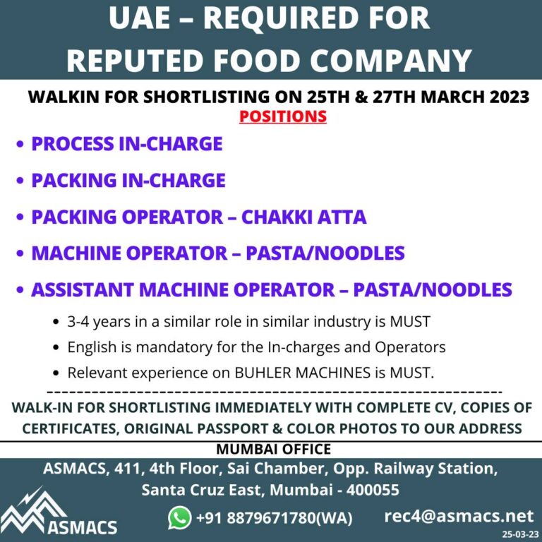 UAE – REQUIRED FORREPUTED FOOD COMPANYWALKIN FOR SHORTLISTING ON 25TH & 27TH MARCH 2023POSITIONS• PROCESS IN-CHARGE• PACKING IN-CHARGE• PACKING OPERATOR …