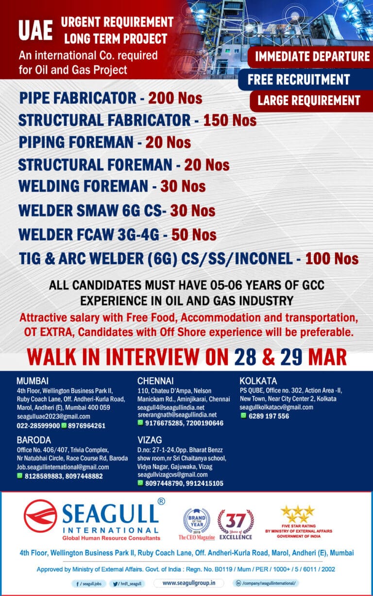 URGENT REQUIREMENTUAE LONG TERM PROJECTAn international Co. requiredfor Oil and Gas ProjectPIPE FABRICATOR – 200 NosSTRUCTURAL FABRICATOR – 150 NosPIPING …
