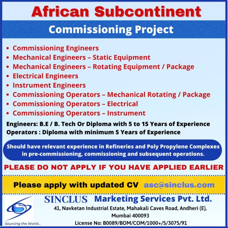 African SubcontinentCommissioning ProjectCommissioning EngineersMechanical Engineers – Static EquipmentMechanical Engineers – Rotating Equipment / PackageElectrical EngineersInstrument EngineersCommissioning Operators – Mechanical Rotating …