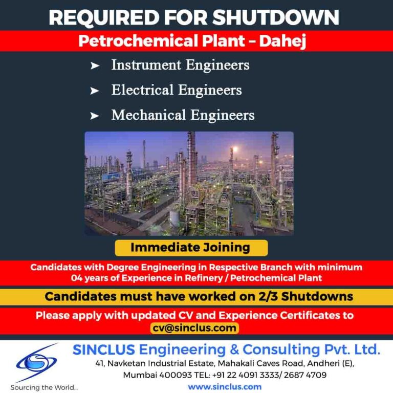 REQUIRED FOR SHUTDOWNPetrochemical Plant – DaheJInstrument EngineersElectrical EngineersMechanical EngineersImmediate JoiningCan 1 ates with Degree Engineering In Respective Branc With mimmum04 …