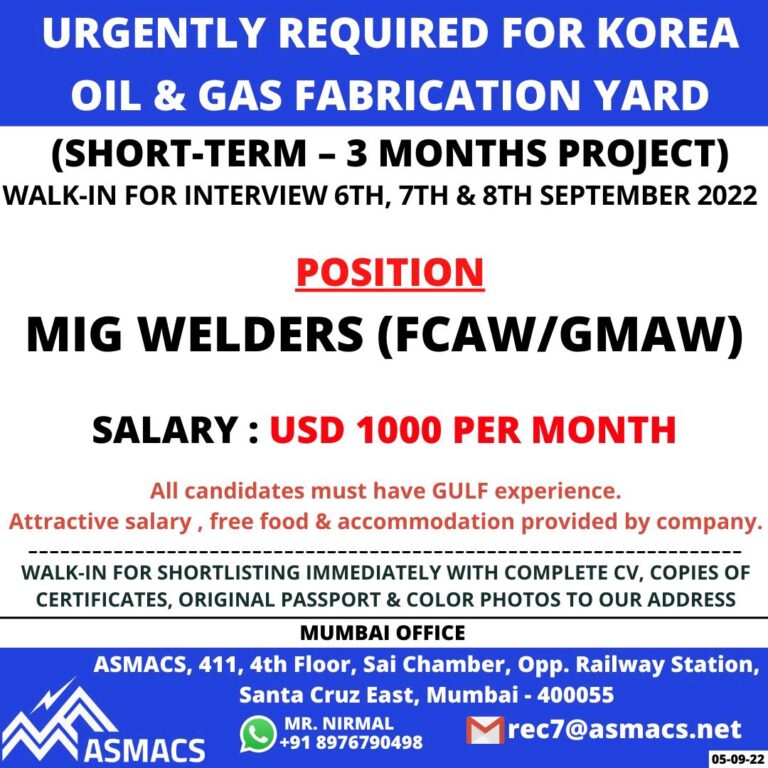 URGENTLY REQUIRED FOR KOREAOIL & GAS FABRICATION YARD(SHORT-TERM – 3 MONTHS PROJECT)WALK-IN FOR INTERVIEW 6TH, 7TH & 8TH SEPTEMBER 2022POSITIONMIG …