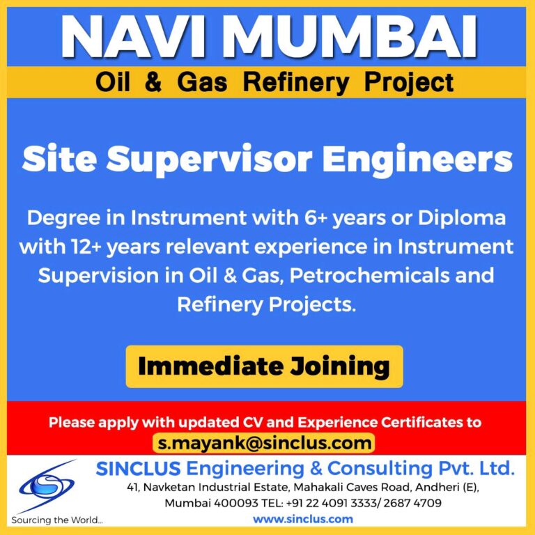 NAVI MUMBAIOil & Gas Refinery ProjectSite Supervisor EngineersDegree in Instrument with 6+ years or Diplomawith 12+ years relevant experience in …