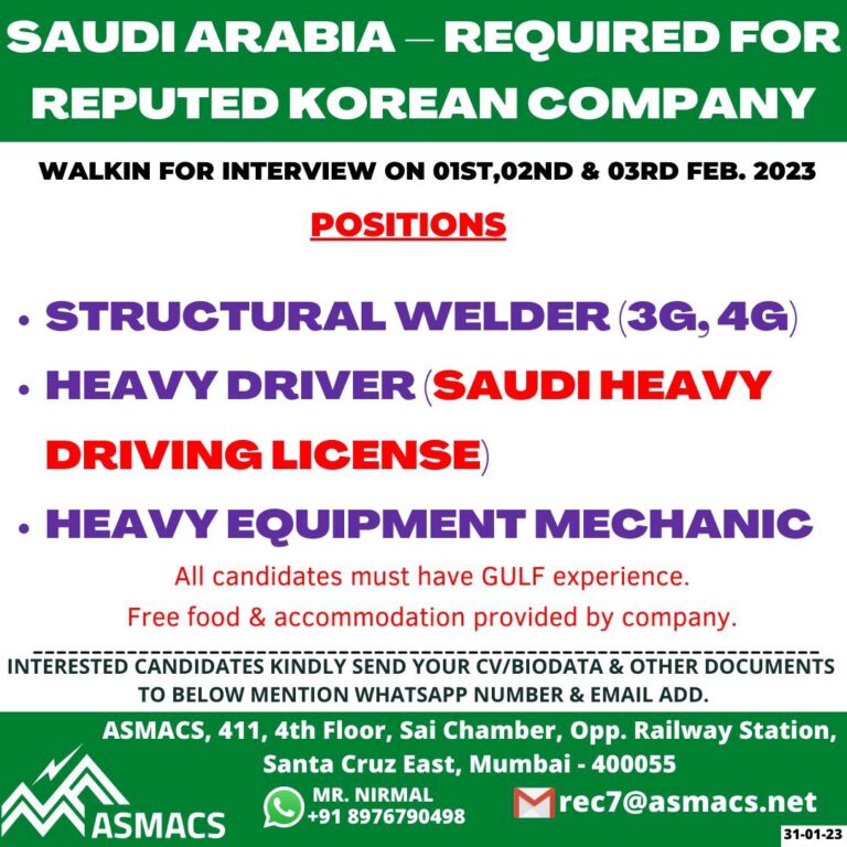 SAUDI ARABIA – REQUIRED FORREPUTED KOREAN COMPANYWALKIN FOR INTERVIEW ON 01ST,02ND & 03RD FEB. 2023POSITIONSSTRUCTURAL WELDER (3e, 4G)HEAVY DRIVER (SAUDI …