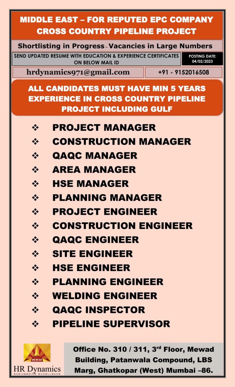 MIDDLE EAST – FOR REPUTED EPC COMPANYCROSS COUNTRY PIPELINE PROJECTShortlisting in Progress-Vacancies in Large NumbersSEND UPDATED RESUME WITH EDUCATION & …