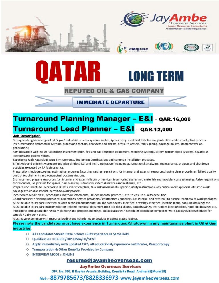 QATAR LONG TERMREPUTED OIL & GAS COMPANYIMMEDIATE DEPARTURE —- QAR.16,000 – QAR.12,000Job DescriptionStrong working knowledge of oil & gas / …
