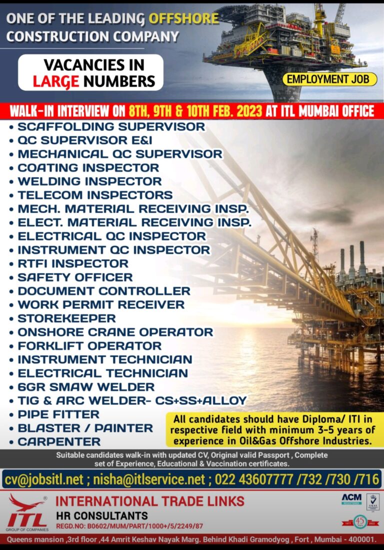 ONE OF THE LEADING OFFSHORECONSTRUCTION COMPANYVACANCIES INLARGE NUMBERSWALK-IN INTERVIEW ON 8TH, 9TH & 10TH FEB. 2023 AT ITL MUMBAI OFFICESUPERVISOR• …