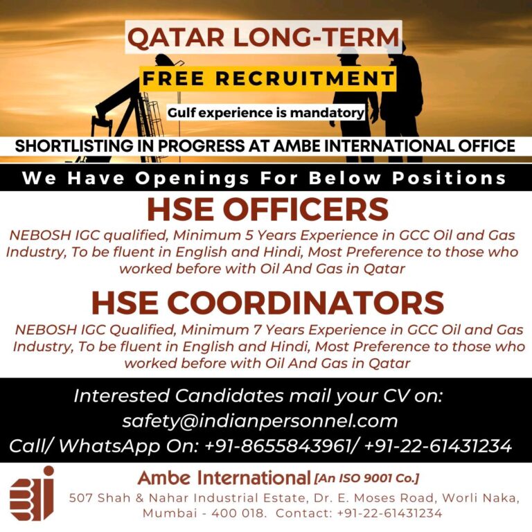 QATAR LONG-TERMFREE RECRUITMENTGulf experience is mandatorySHORTLISTING IN PROGRESS AT AMBE INTERNATIONAL OFFICEWe Have Openings For Below PositionsHSE OFFICERSNEBOSH IGC qualified, …