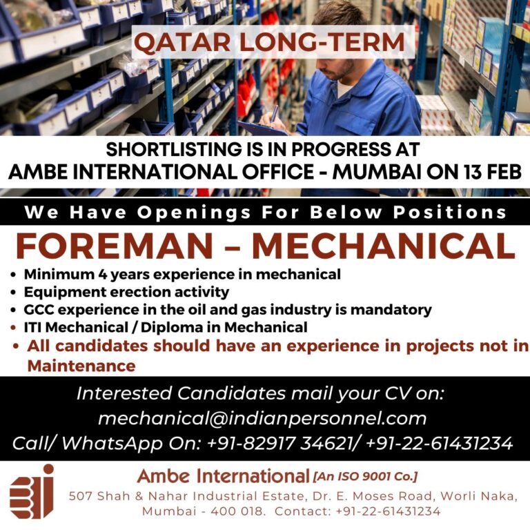 QATAR LONG-TERMSHORTLISTING IS IN PROGRESS ATAMBE INTERNATIONAL OFFICE – MUMBAI ON 13 FEBWe Have Openings For Below PositionsFOREMAN – MECHANICAL• …
