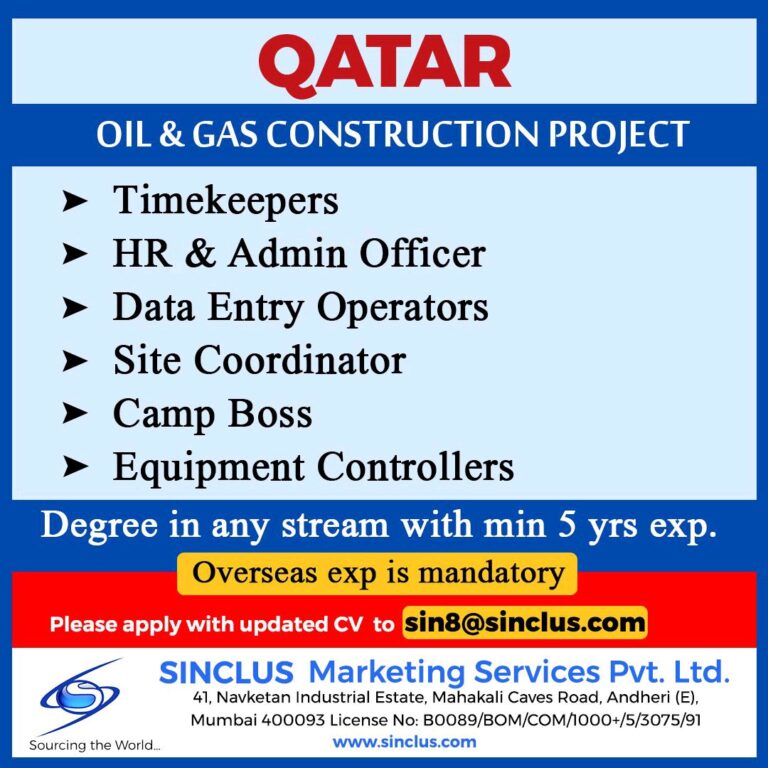 QATAROIL & GAS CONSTRUCTION PROJECTTimekeepersHR & Admin Officer➤ Data Entry Operators➤ Site Coordinator➤ Camp Boss➤ Equipment ControllersDegree in any stream …