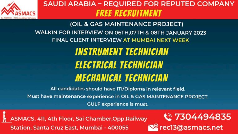 SAUDI ARABIA – REQUIRED FOR REPUTED COMPANYFREE RECRUITMENT(OIL & GAS MAINTENANCE PROJECT)WALKIN FOR INTERVIEW ON 06TH,07TH & 08TH JANUARY 2023FINAL …