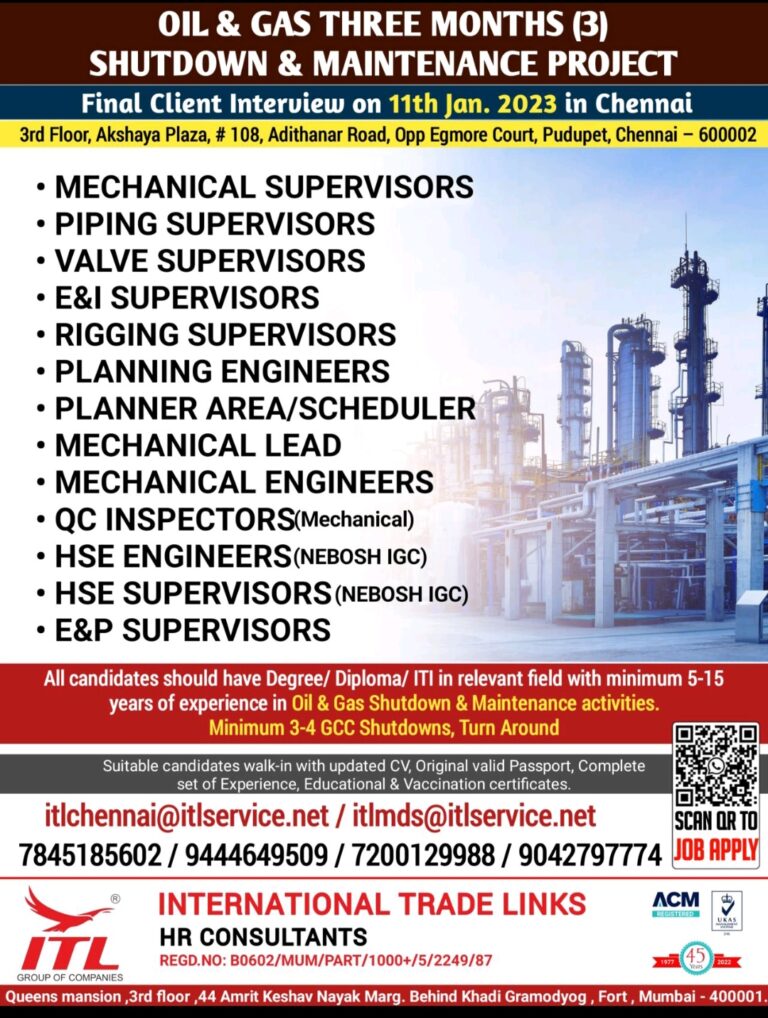 OIL & GAS THREE MONTHS (3)SHUTDOWN & MAINTENANCE PROJECTFinal Client Interview on 11th Jan. 2023 in Chennai3rd Floor, Akshaya Plaza, …